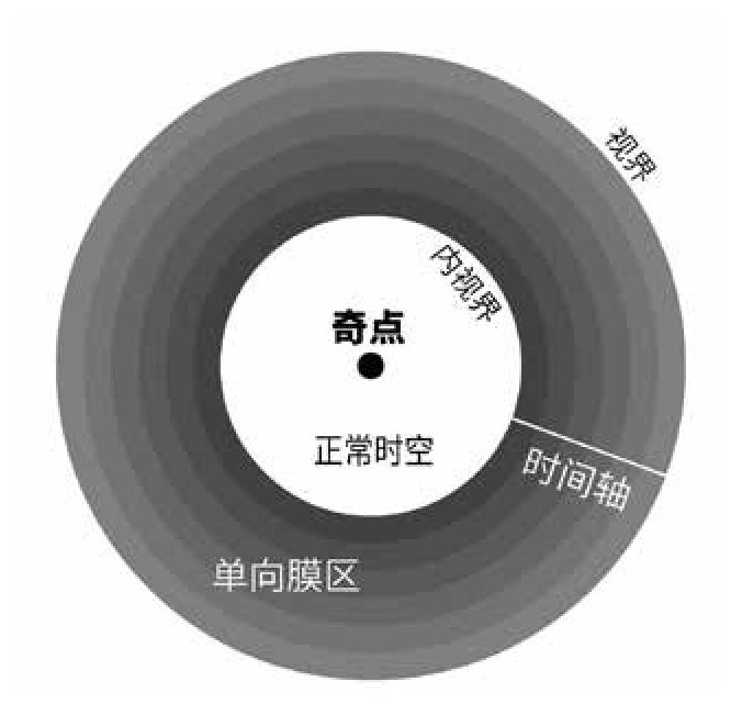 你进去了,你也很绝望,但是向里飞了一段时间,你又觉得不对劲了。此时你已经穿过内视界面来到黑洞的最里面,这个RN黑洞(图15-4)和史瓦西黑洞不同,RN黑洞的内部有一个正常的时空,外边是单向膜区,里面核心部分是正常的时空。你要是带的燃料足够,多带干粮多带水的话,或许一时半会儿还死不了,但是你也就别想着能出去了。你不想活了,一头撞向奇点,但是你会发现,一股斥力推着你,死活不让你靠近,想撞也撞不上去。过一会你发现事情不对劲了,时间似乎循环了。简而言之,你走了一个“闭合类时线”。