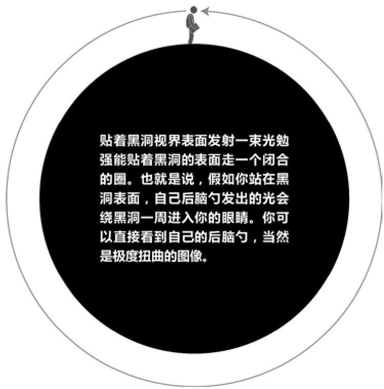 你靠近黑洞的视界表面的时候,周围看到的一切都会扭曲(图15-2),假如你站在视界表面之上,贴着视界表面发射一束光,这一束光会弯曲,沿着表面转一圈转回原点。所以说,黑洞表面是一个分界线,在这里光都逃不出去。你眼力好的话,可以直接看到自己的后脑勺,后脑勺出发的光,绕着黑洞转了一圈来到你的眼前被你看到。你也可想而知,周围的景物又会扭曲成什么样子。