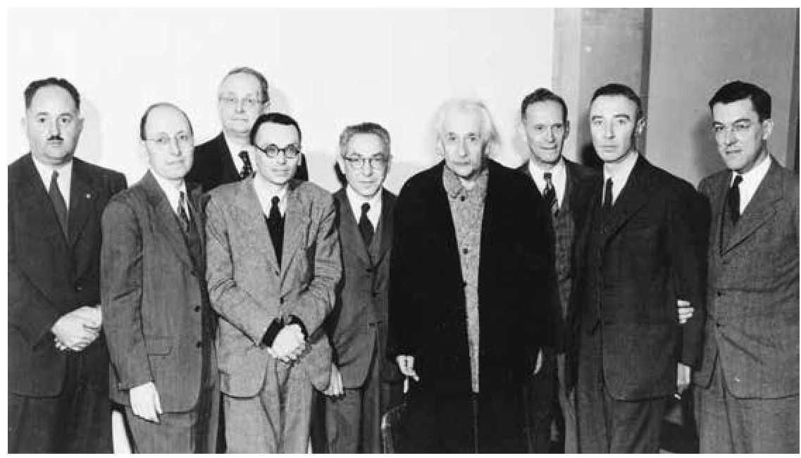 从左到右 罗伯逊 E·魏格纳 H·外尔 K·哥德尔 I·I·拉比 爱因斯坦 鲁道夫·拉登堡 奥本海默 G.M.克莱门斯