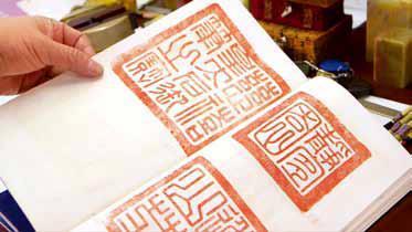 篆刻属于摹画的一部分。古画都有印章,我们是专门摹印章。摹画裱完以后,最后一个程序是盖章,所以说是比较特殊,重中之重的。从金禹民先生算起,我们现在是故宫摹章传承的第三代。