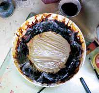 最难的是色彩。漆是从树上割下来的一种树脂,采下来之后它是白的,氧化之后它就逐渐变红,变棕,深棕。经过提炼,变成半透明的棕色。在氧化干燥的过程中,它的颜色就从来没有一样过,同一批漆,或者同一碗漆,上午刷一次,下午再刷一次,干燥之后那个颜色都不一样。而且它在干燥之后它还会变色。所以用天然漆做修复时,你想把色彩调到一致是非常难的,那个纯就是一个经验。
