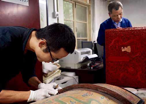 实际上,平时跟业务部门交接,不是每件文物来了之后我们都能修。不能修的我就不接。因为漆工的种类多,清宫藏品你细分的话有几十种。以前有石灰的柜子,那个我们就修不了。工艺种类多,一个人经验再多也可能遇到你没遇到过的东西。