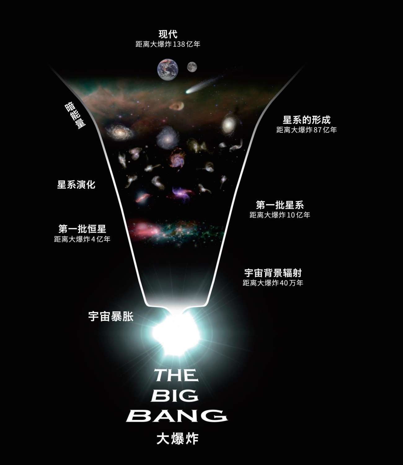 宇宙出现在大约138亿年前,源于宇宙学家所说的“大爆炸”。这是所有历史日期的开端,我们对大爆炸之前的世界一无所知:我们不知道在此之前是否存在时间、空间甚至虚无,我们缺少任何与此有关的信息或是理论;这也正是创世故事开始的时候。但是其实,从宇宙出现的那一刻开始,我们便能够讲述一个符合现代科学基本理念的创世故事——这个故事建立在大量且仍在不断增加的证据之上。