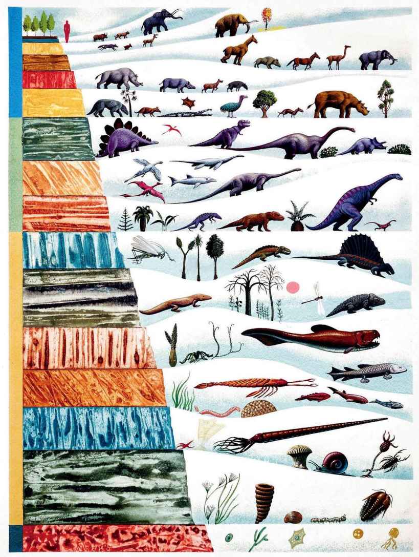 最早的生命原核生物诞生于太古宙(38亿年至25亿年前),紧随其后的是真核生物。距今约6亿年前的震旦纪(也称埃迪卡拉纪),地球上出现了多细胞的“埃迪卡拉生物群”。地球进入古生代之后,进化速度大大加快。最早的两栖动物、爬行动物和哺乳动物都在这一时期出现。距今2.5亿年前,地球进入中生代,这一时期的生物圈几乎被恐龙主宰。恐龙灭绝之后,地球进入新生代,现代生物开始出现,包括最晚进化出来的人类。