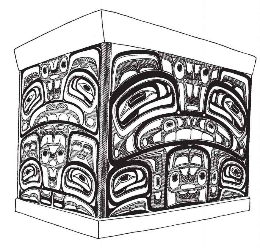 钦西安人使用的弯木带盖木箱,用于储存毛毯等物品。箱体四周是用赤铁矿粉等天然颜料绘制而成的线条纹饰。该物品是富足采集狩猎者身份的代表。