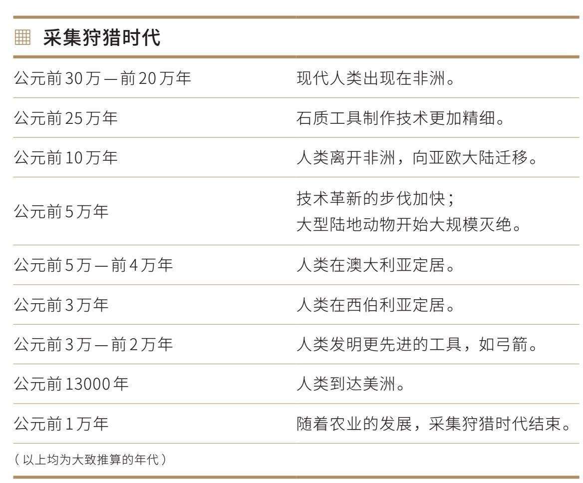 近年,“走出非洲”假说的一些支持者提出,由于学者们进行的考古研究多在亚欧地区,而非假定的现代人类的诞生地非洲,因此上述变化的重要性可能被人为夸大了。在对现有的来自非洲的考古物证进行仔细分析后,人类学家莎莉·麦克布里雅蒂(Sally McBrearty)和艾莉森·布鲁克斯(Alison Brooks)指出,非洲典型人类活动的考古物证可以追溯至20万至30万年前,这和我们发现的最早的人类骸骨是符合的。如果麦克布里雅蒂和布鲁克斯是正确的,那人类最早应该出现在距今20万至30万年前的非洲,这个时期也是人类历史真正的开端。我们在这本《极简人类史》中采用的历史分期正是基于这些发现。我们暂时采纳这种说法,即最早的人类出现在距今约25万年前,这也标志着人类历史的开端。但是,我们必须牢记,这个年代可能会被修改。