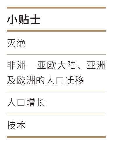 如果你所在的部落平均每年迁移10英里(约16公里),想想你们需要多少年才能从非洲出发,穿越俄罗斯和西伯利亚,到达阿拉斯加,然后再横穿整个美洲,抵达最南部的火地岛?完成迁移需要技术进步。再想想当你从非洲(这里气候炎热,动植物资源丰富)启程,到达西伯利亚(这里气候寒冷,植被缺乏,有很多大型动物,如猛犸),再到达北美洲(这里森林茂盛,充满了未知的动物和植物),再先后穿过中美洲的热带丛林和安第斯山脉,抵达火地岛,一路上你需要多少新的知识技能?
