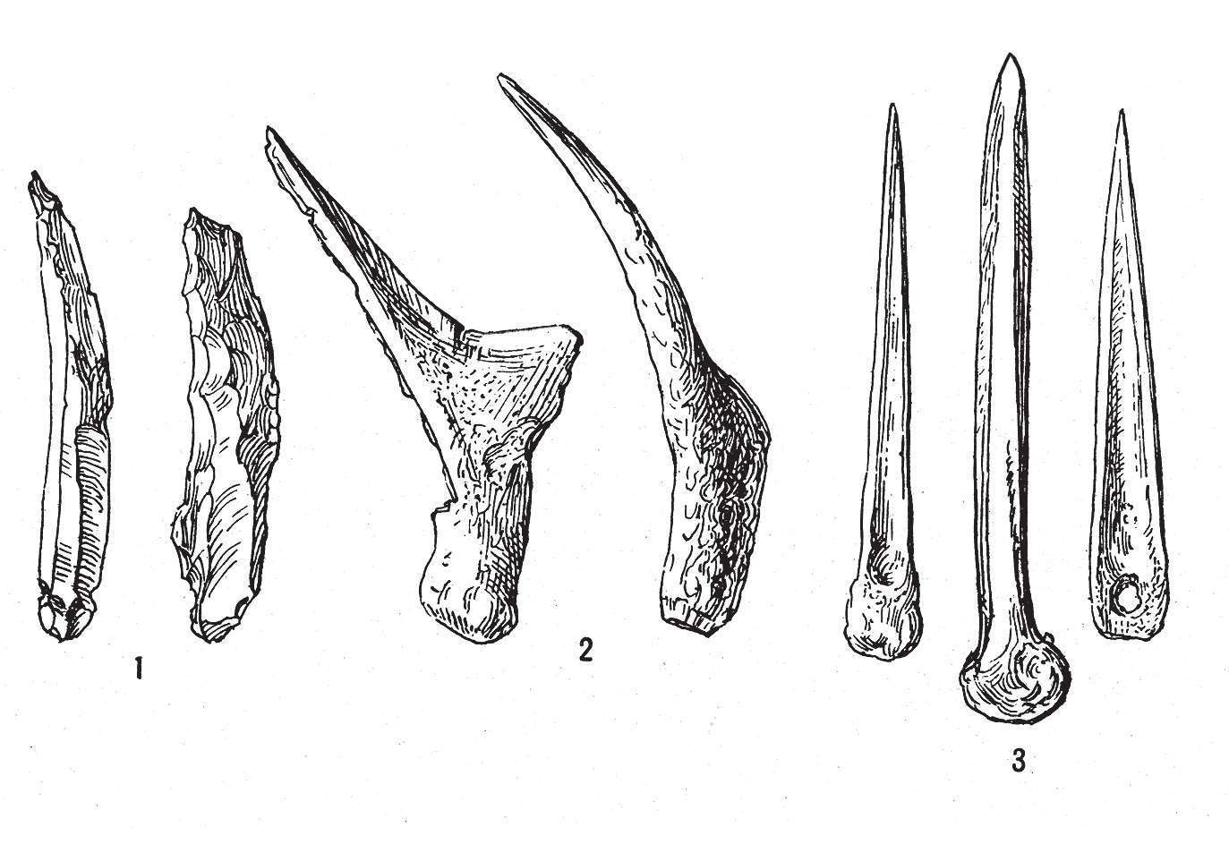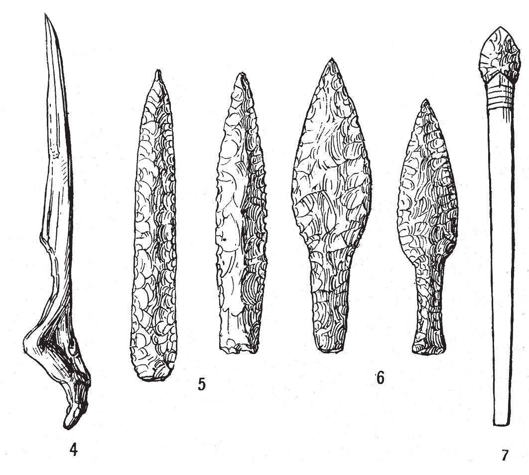 图中展示的是各种早期的尖状工具。第1组工具用石质薄片制成;第2组用鹿角制成;第3组用动物骨骼制成;第4组用鹿角制成;第5至7组用切割而成的石头制成。