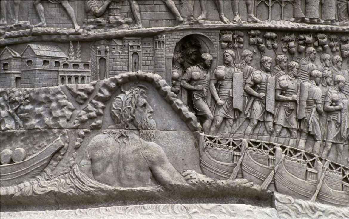 “罗马军团跨过舟桥”,图像来自图拉真的纪功柱。图拉真柱为罗马帝国皇帝图拉真所立,以纪念他胜利征服达西亚。公元2世纪,是罗马帝国历史上实行向外扩张政策的强盛时期。