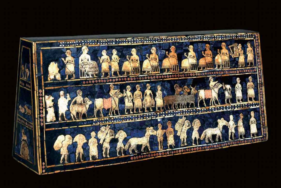 乌尔帝国建基于两河流域南部地区,那里是世界上最早的文明国家的发源地。乌尔城是乌尔帝国的都城,“乌尔的旗帜”出土于乌尔城的皇室墓穴,四周用马赛克精心镶嵌而成,分为“战争”与“和平”两个场景。图中显示的是“和平”场景。