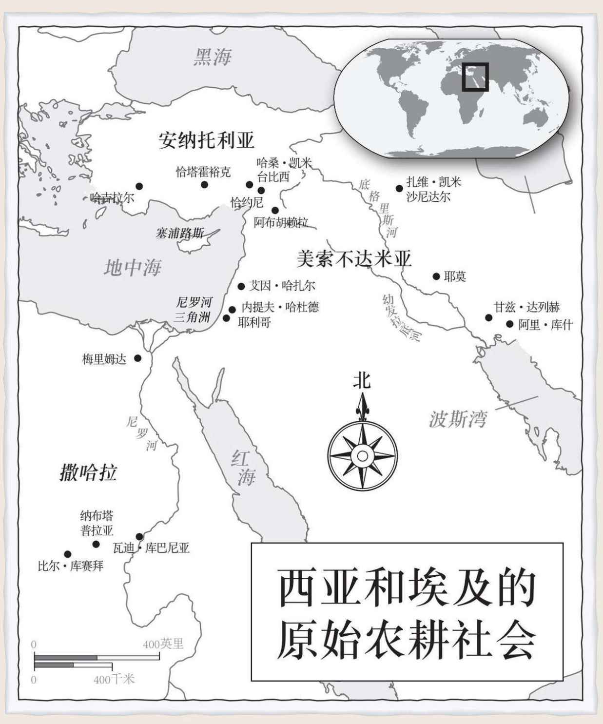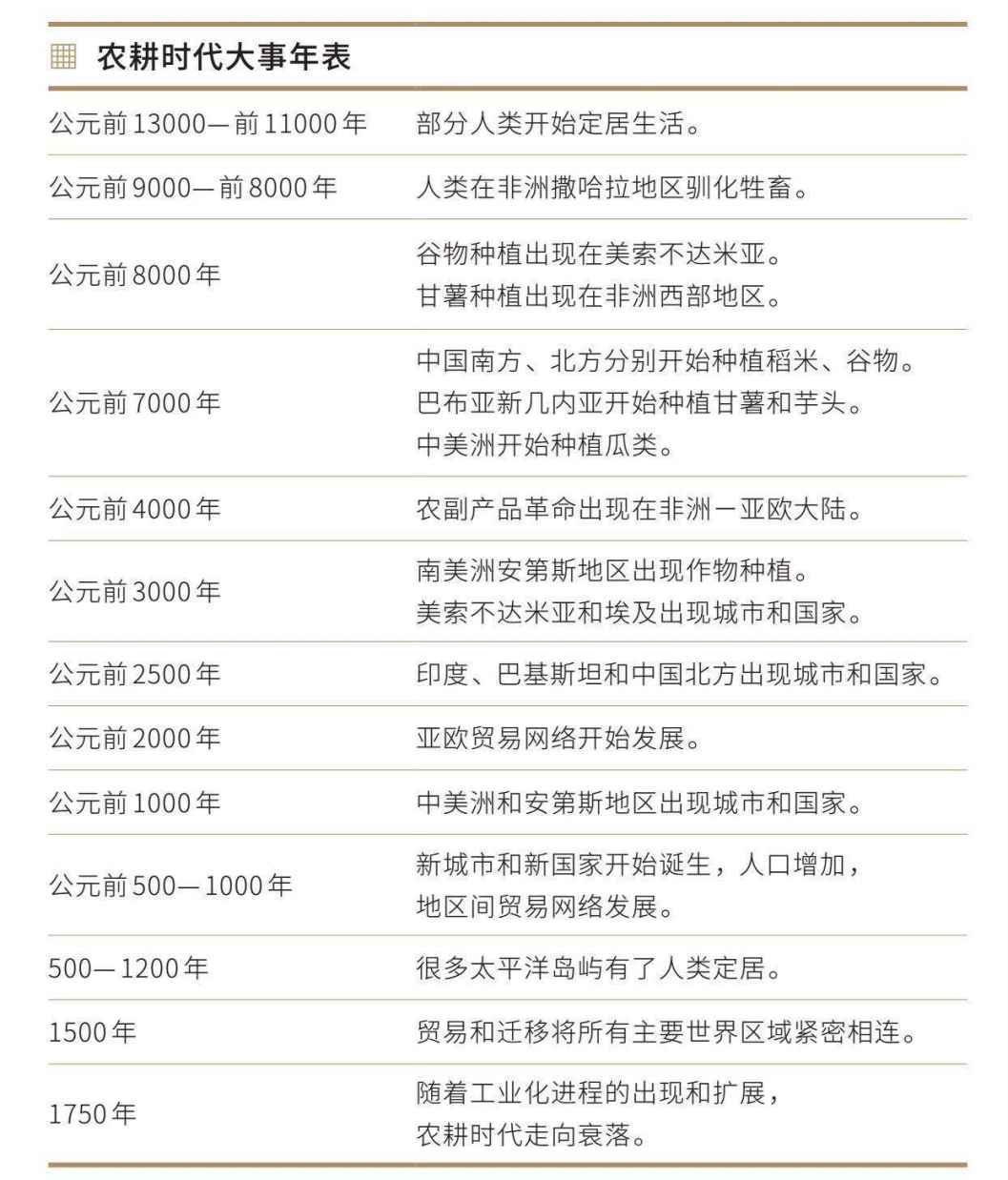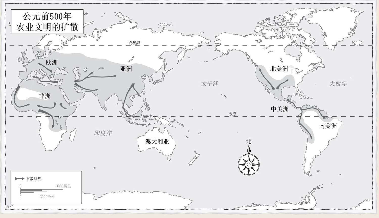 农耕时代最早证据的确切日期还有待修正。迄今为止,农耕时代的最早证据来自美索不达米亚和尼罗河谷之间的走廊地带,这是连接非洲和亚欧大陆的重要通道。在肥沃的新月地带(即环绕美索不达米亚地区重要河流的弧形高地),自公元前8000年(距今1万多年前)起,人们就已开始种植谷物。在尼罗河以西的撒哈拉沙漠(那时的土地还不像今天这样贫瘠),人们可能早在公元前9000年至前8000年就已经学会驯化牲畜,在随后的1 000年内,人们可能又开始种植高粱。在非洲西部,人们从公元前8000年起就开始种植甘薯。在中国,人们从公元前7000年起便开始在南方种植稻米,在北方种植其他谷物。此时,在马来群岛的巴布亚新几内亚,人们已经开始了基于甘薯和芋头(一种大叶的亚洲热带植物)种植的农业生产。最早种植根茎类作物的部落可能来自热带沿海地区,然而随着冰河时代后期海平面的上升,大多数这样的遗迹都被淹没了。在中美洲(含墨西哥及其南部半岛的大部分地区),人们尽管可能早在公元前7000年就开始种植瓜类,但直到公元前5000年,系统性农业的证据才开始出现。在安第斯地区,农耕时代开始的最早证据出现在公元前3000年。正是从上述地区和其他农业生产独立出现的地区,农业生产技术及其生活方式逐渐扩展到世界的大多数地区。