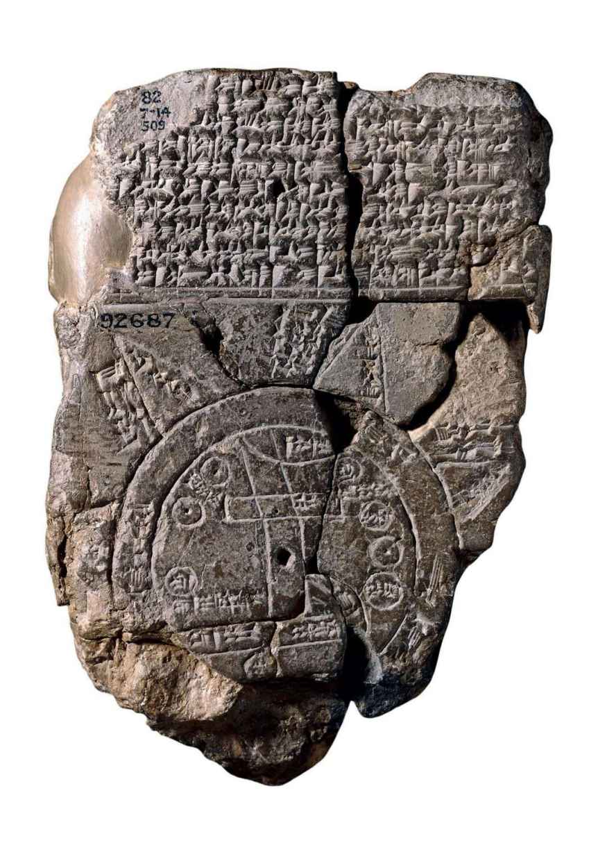 巴比伦世界地图是已知最早的世界地图,它反映了文明诞生时,人们对当时世界的认识。地图刻在一块楔形文字泥板上,分为上下两部分。上半部的楔形文字,讲述了巴比伦帝国“荒废的城市”。位于下部的最显眼的圆点,代表着当时世界的中心——巴比伦城幼发拉底河从城市中间穿过,城市四周环绕着“盐海”,更远处呈辐射状的三角形图案,则代表了“遥远的未知之地”。
