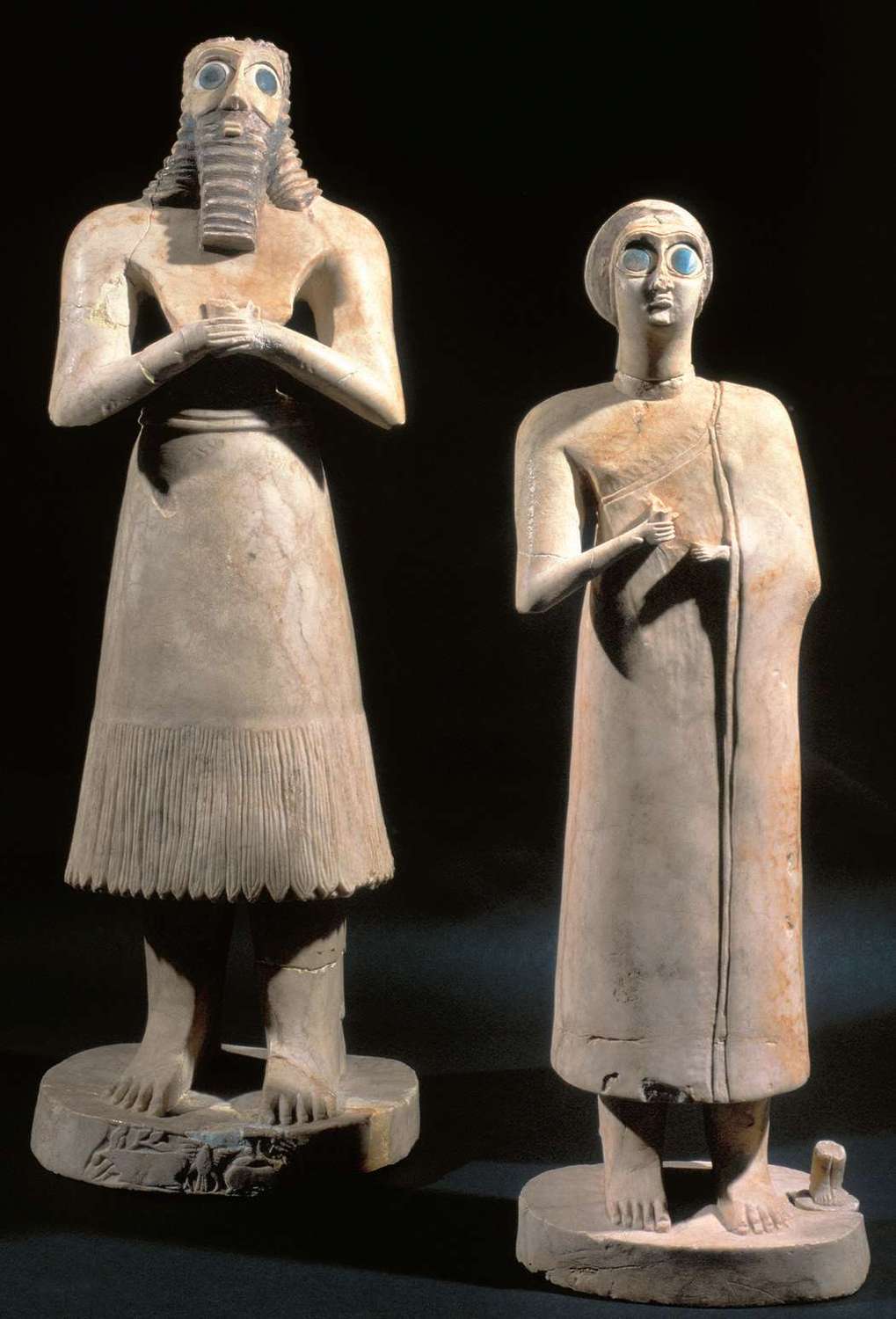 两尊阿布广场寺(Square Temple of Abu)的信徒雕像,制作于约公元前2700年。广场寺位于苏美尔的埃什南纳,这是美索不达米亚的一座城邦,也是世界上最为古老的城市之一。雕塑展现了人类历史上第一批城市居民的风貌,贝壳贴的大眼睛尤其引人注目。