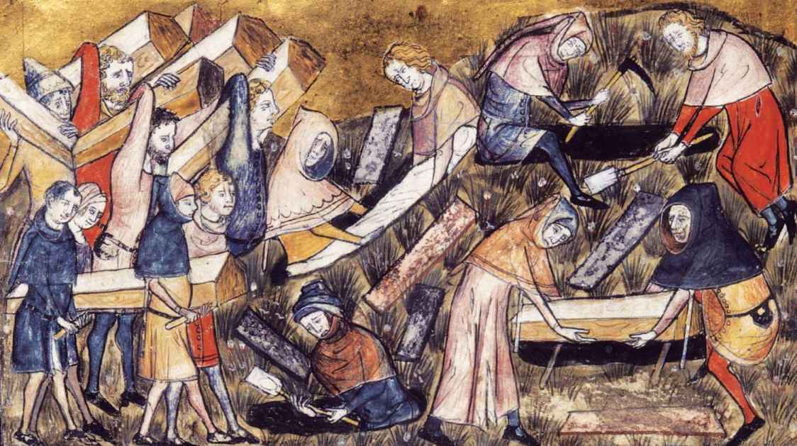 在佛兰德斯的图尔奈,人们正在埋葬感染黑死病的死者。农耕社会为病菌(致病媒介和病原体)创造了更为适宜的环境。据估计,瘟疫爆发期间的中世纪欧洲,约有30%-60%的人死于黑死病。