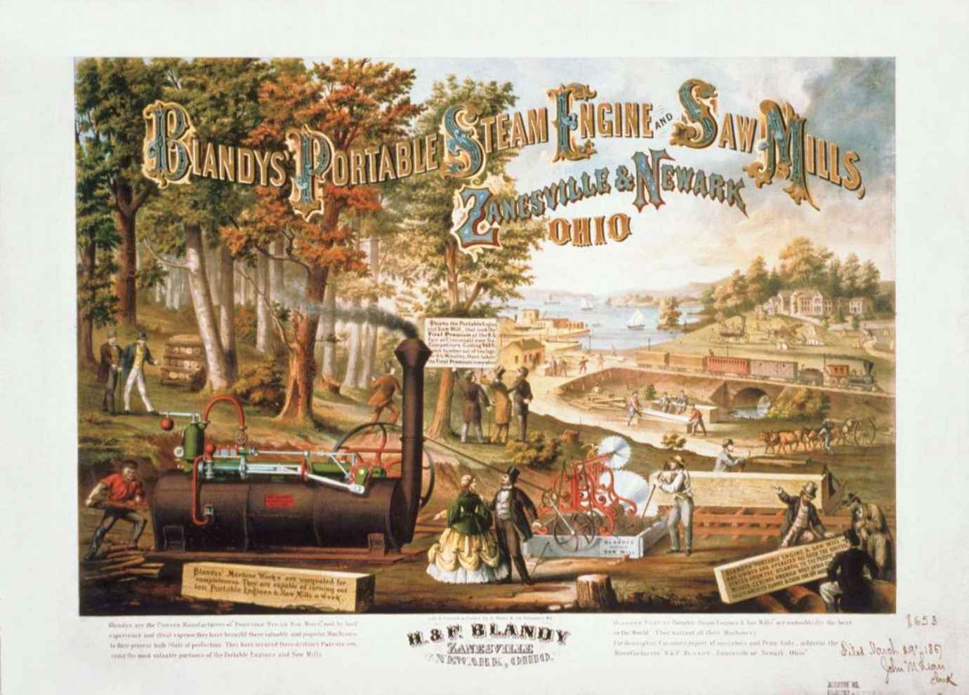19世纪中叶,第一次工业革命的浪潮扩展到美国。蒸汽机被广泛应用于采矿、冶金、机械等工业生产部门。图为1867年美国俄亥俄州一家木材加工厂的产品海报,展示了将蒸汽机用于木材加工的场景,该工厂加工的木材可以被用作修建铁路的枕木。铁路的修建,大大加快了资源、信息的交流速度,对促进美国经济具有特殊的革命性意义。