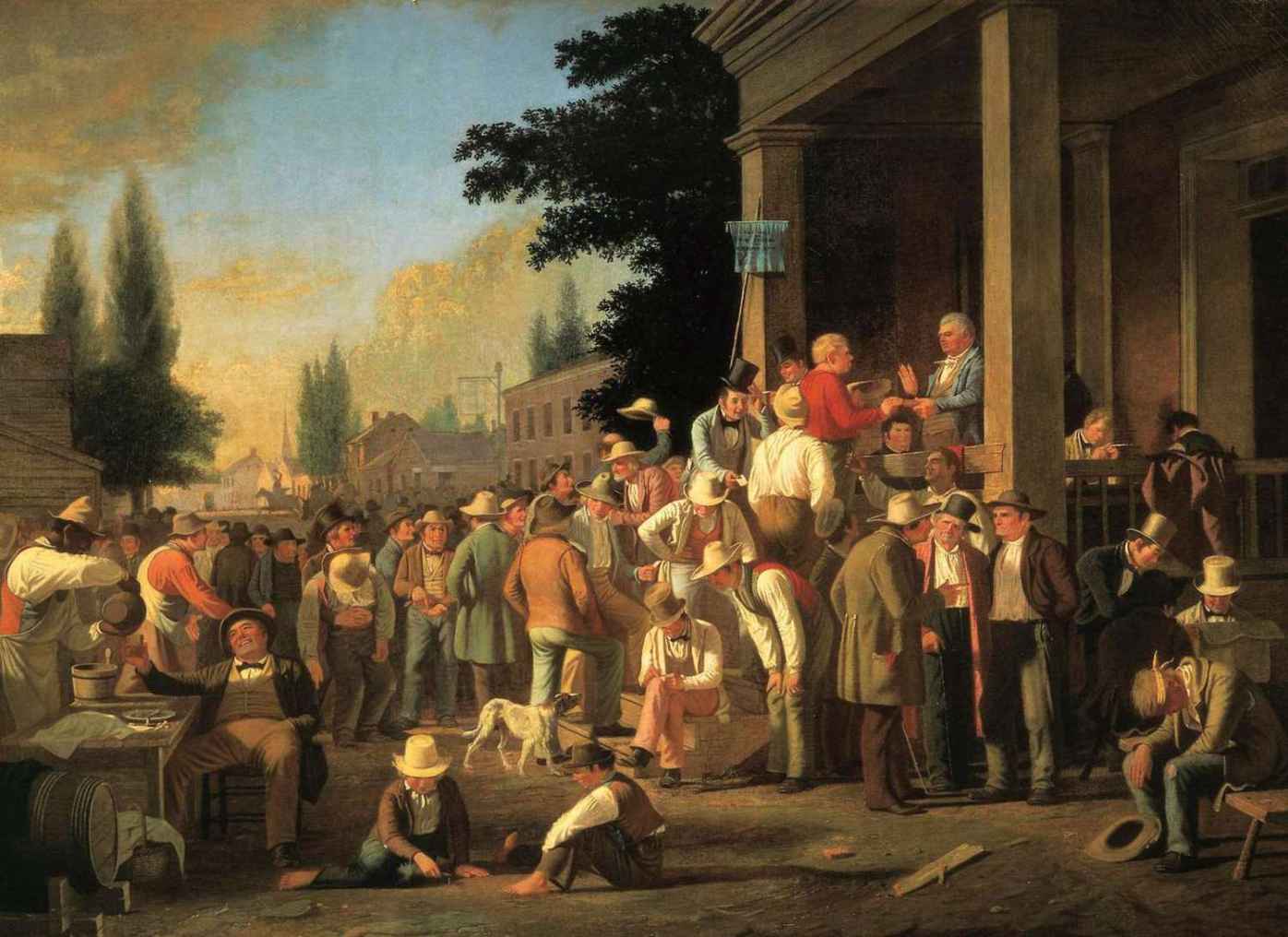 美国建国初期,选举权受到财产、种族、性别等多种限制,主要是成年白人男性基督徒的特权。到19世纪中叶以后,随着工业革命的展开,普通民众要求普选权的呼声越来越高。图为1851年密苏里乡村选举的场景。