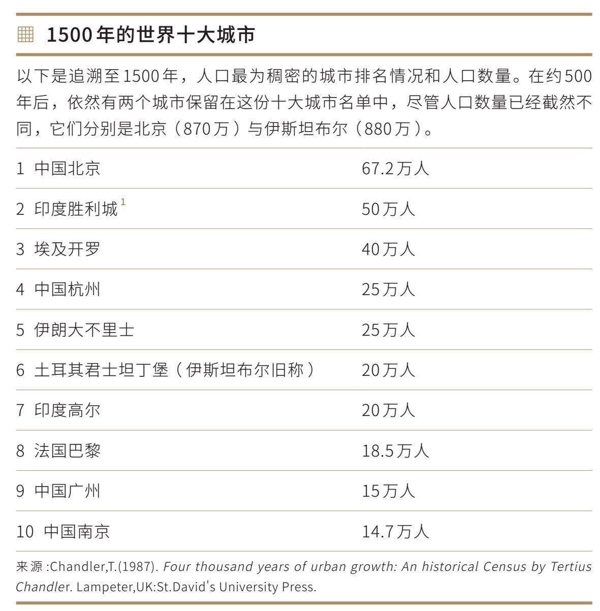 人口增长带动了人类社区平均规模的扩大。在1500年,全球只有约50个城市的居民人口超过10万,还没有居民人口超过100万的城市。