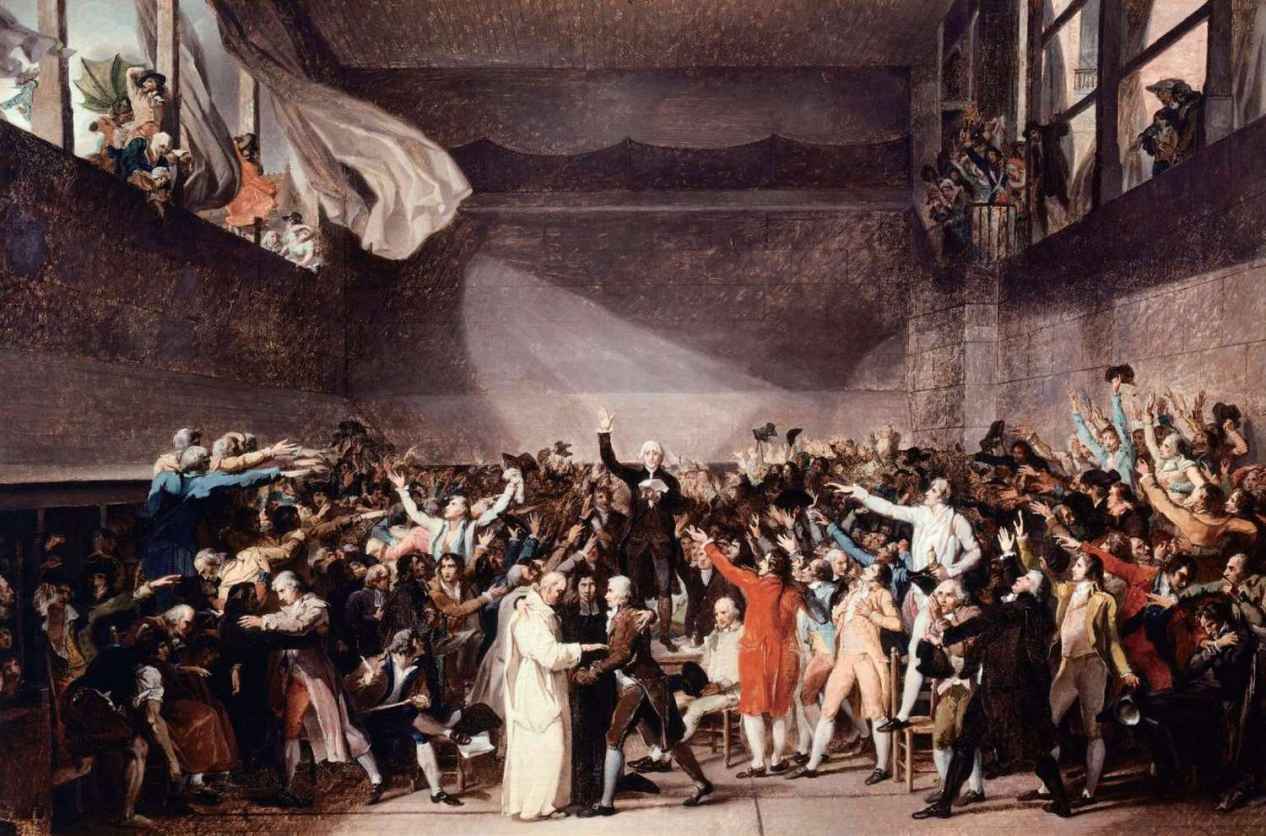 法国大革命是现代民主政治发展史上最具代表性的一次革命,“网球场宣誓”是法国大革命的前奏。当时第三等级要求召开国民议会,遭到国王路易十六的压制。国民议会代表在凡尔赛宫室内网球场聚集宣誓,“不制定和通过宪法,绝不解散”。