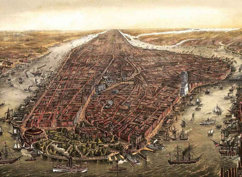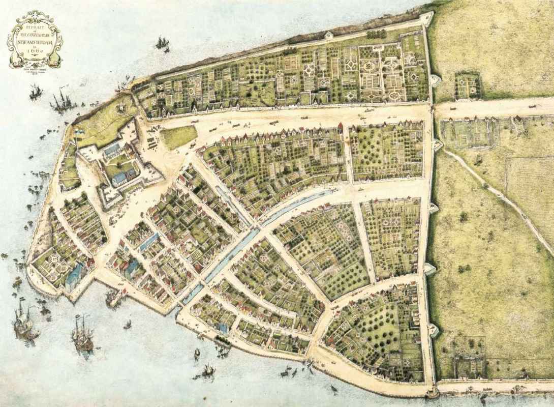 两幅图对比显示了近现代城镇的沿革。左图是目前已知最早的新阿姆斯特丹城市地图,创作于1660年。新阿姆斯特丹原是荷兰殖民者从美洲印第安人手中购买的岛屿曼哈顿,后来改称纽约。右图是工业化后期曼哈顿的城市俯瞰图,大致延续了左图的城市规划格局。