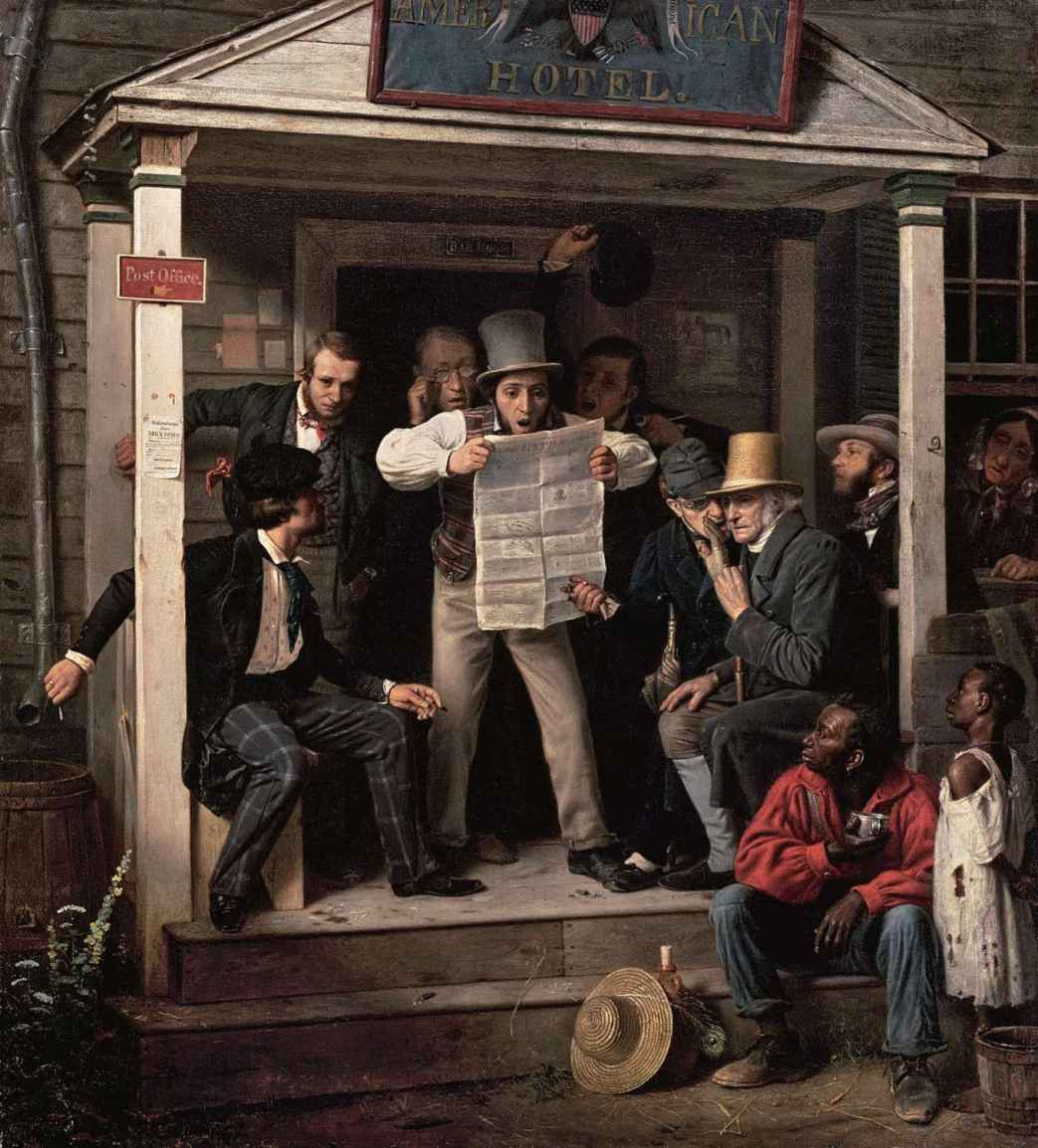大众传媒使信息传播不再受时间和地域的限制,信息交流的速度大大加快。图为1848年美国民众通过报纸了解墨西哥战争。