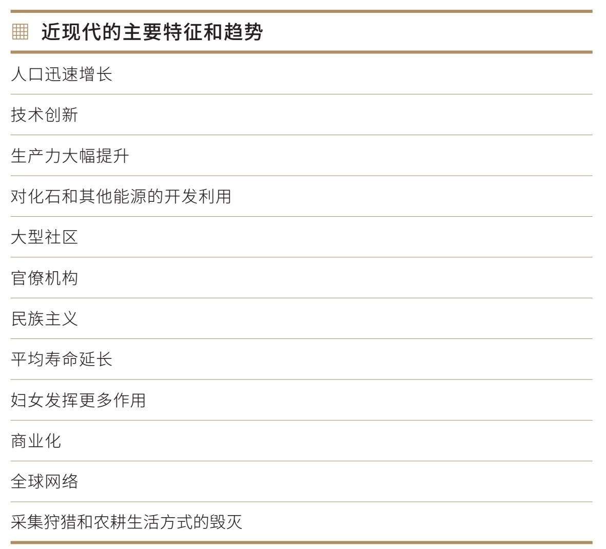 无法将近现代作为整体来对待,让我们难以明确其主要特征,也说明了我们刻意使用“近现代”这一模糊称谓是有道理的。目前人们划分近现代的要素(定义特征)似乎是创新速度的不断加快。新技术增强了人类对自然资源的掌控力,并且促进了人口的迅速增长。技术变革和人口变化反过来改变了生活方式、文化和宗教传统、医疗和人口老龄化模式,以及社会和政治关系。
