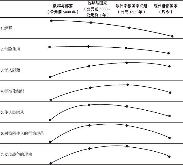 最后,我们再回到最初的问题,即关于宗教的功能与定义。我们现在已经了解为何宗教难以定义:因为宗教功能就像鱼的发电器官,会不断地演化。其实,宗教功能的变化甚至比鱼的发电器官的变化更大。鱼的发电器官只有6种功能,宗教则有7种功能(见图9–1)。在这7种功能当中,有4种在宗教的某个发展阶段并不存在,在另一阶段虽可见5种功能,但这些功能已经式微。有2种功能——解释的功能(第1种)和消除焦虑的功能(第2种)在公元前5 000年的远古到顶点,但近1 000年已经衰退。其他5种功能在早期尚未存在(第3、4、6、7种)或是不明显(第5种),在酋邦和国家兴起之初(第5、6、7种)或在欧洲宗教国家兴起之时(第3、4种)才登峰造极,之后则走下坡。