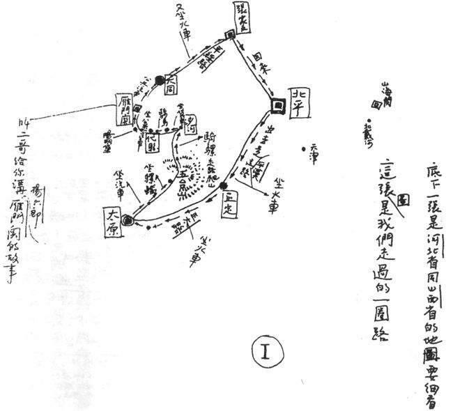 第四,好在平绥铁路没有断,我同爹就慌慌张张绕到大同由平绥路回北平。现在我画张地图你看看,你就可以明白了。