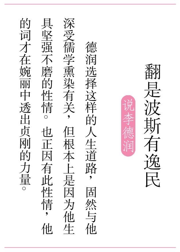 德润选择这样的人生道路,固然与他深受儒学熏染有关,但根本上是因为他生具坚强不磨的性情。也正因有此性情,他的词才在婉丽中透出贞刚的力量。
