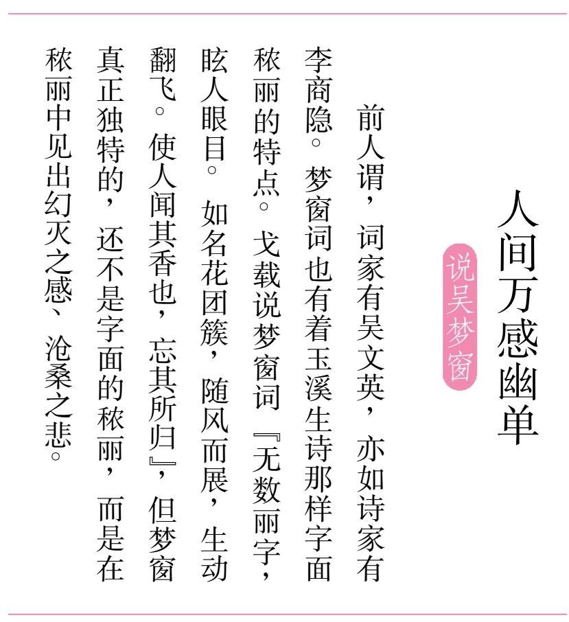 读 梦窗 词, 很明显可以感到, 这是一个 毕生生活在痛苦与 绝望 中的人。 然而, 梦窗 的忠 厚便在于, 他的心纵然是绝望 的,却 总是不让读 者也感到 绝望。 他往往在词的结尾 或过片振起一笔,如: