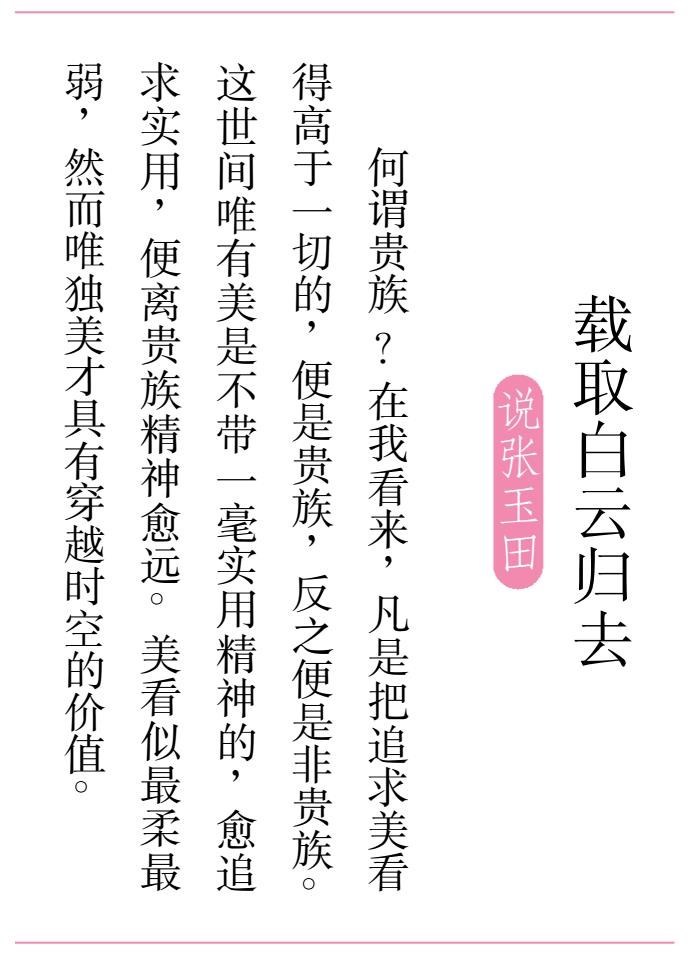 何 谓贵 族?在 我看来 ,凡是把追求美 看得高于一 切的 ,便是贵 族,反之便是非贵 族。这 世间 唯有美是不 带一 毫实用精神的 ,愈追求 实用,便 离贵 族精神愈远。美 看似 最柔最弱,然而 唯独美才具有 穿越时 空的 价值。况且,玉田词的 骚姿雅骨,犹有一层 更深的 精神在 。