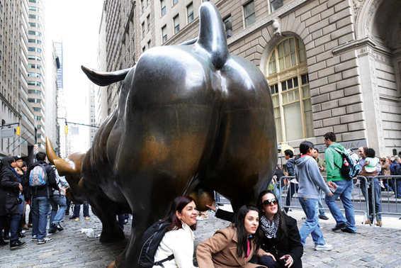 一平方英里之内——也正是荷属新阿姆斯特丹的市区——就是建国至今的金融区:华尔街,纽约证券交易所,世贸中心,全国跨国银行,投资、信托、保险公司,联邦储备,还有那个现在成为过街老鼠的AIG……也就是说,这里就是纽约、美国、世界的金融中心,牛市即从这里开始牛。只不过,在全球经济给搞得如此惨痛的今天,那头大铜牛也不再像是牛市那头猛牛了,简直变成了牛魔王。