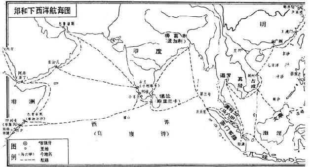 在郑和第四次到第七次下西洋的远航中,他的船队最远曾到达非洲的东海岸。航行途中经过的主要国家及地区有满刺加(今马六甲)、爪哇、占城、苏门答腊、阿鲁、锡兰、柯枝、古里、甘把里、阿丹、刺撒、南渤利、彭亨(今马来西亚彭京河口)、急兰丹(今马来西亚哥打巴鲁)、加异勒、忽鲁漠斯(今霍尔木兹海峡格什姆岛)、比刺、淄山(马尔代夫群岛)、孙刺、木骨都束(今摩加迪沙)、麻林(今肯尼亚的马林迪)、仆刺喹、苏禄、沙里湾泥、竹步(今索马里)等。