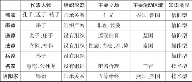 当然,诸子百家虽貌似流派杂多、主张不一,但也有很多相同的地方,如他们都关注社会秩序和社会治理的问题,很多学派之间的主张也不完全对立,有些学派具有多个学派的特征。当然,如果就对中国社会的影响而言,儒家、道家和法家影响最大;就审美文化和社会心理而言,可以说是儒道互补;而就政治文化而言,则是儒法互补。总之,诸子百家创造了中国文化的第一个高峰,他们深邃的思想,对中国传统文化影响久远(见下表)。