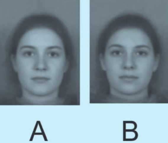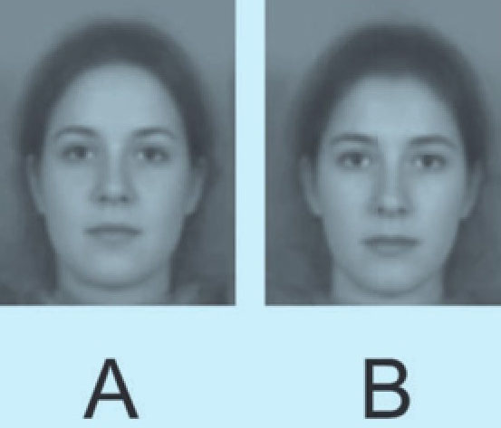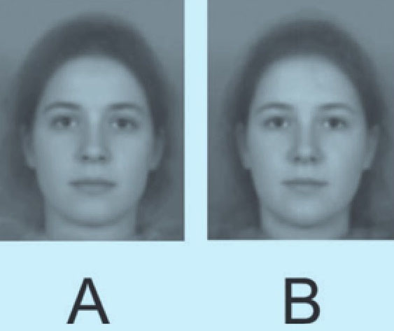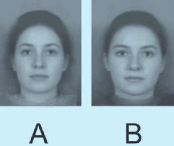 几年前,斯特灵大学的安东尼·里特尔和圣安德鲁斯大学的大卫·佩瑞特两位心理学家开始了一项极具吸引力的研究课题:人类面部与性格的关系。将近200人填写了调查问卷,问题涉及五大方面(即先前提到的开放性、责任心、外向性、宜人性和神经质)。在每个方面中得分最高和最低的人被拍下相片,并通过电脑程序将相片进行合成,形成四组图:低得分女性、高得分女性、低得分男性和高得分男性。这个心理技巧的原理也很简单。设想一下两个人的肖像照片,二者都是浓眉大眼,但是其中一个人的鼻子小,另一个人的鼻子大。为了合成二者的面部,研究者把两张相片扫描进电脑,缩小光线差异,调整图像,确保主要面部特征——如嘴角和眼睛——大致在相同位置上,然后将一张图像叠加在另一张上,进行折中合成。如果两张图像均是浓眉大眼,后期合成图也会呈现出这些特征。而如果一个鼻子小、一个鼻子大,那么最终的图像呈现的将是中等大小的鼻子。