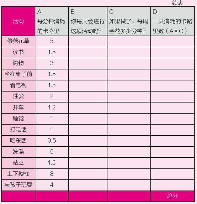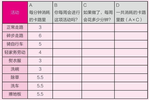 克鲁姆与朗格的研究是具有争议性的,如果这个实验真的站得住脚,就说明若你意识到自己每天从事的工作消耗了多少卡路里,对你的健康就是有好处的。下面这个图表给出了一个平均体重的人在进行各种活动时所消耗的能量。你可以参照图表计算自己每天所消耗的卡路里。