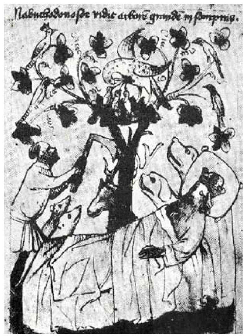 梦中所出现的这类神话彼此浓缩且修正的方式,描绘着尼布甲尼撒的梦(参考下页图)351。虽然那幅画看起来没什么异样,只是呈现那个梦而已,如果我们仔细研究其细节的话,很快就会发觉,如此一来画图的艺术家又做了一次那个梦。这棵树是从国王的肚脐长出来的(非正史的传说),也是从基督祖先、亚当的肚脐长出来的谱系352。因此他戴着塘鹅的冠冕,以他的血喂养男孩,也就是那些著名的“寓言的基督”。除此之外,塘鹅还画了比喻的四个形体的排列,那四只鸟就站在象征四位传福音的人的位置。在下方可以找到相同的四个形体,也是四只满怀希望仰望着的动物,鹿是基督的象征353。这四个双重单位与炼金术的表象有着最密切的关系:上方是飞禽,下方是走兽,前者(习惯上)是鸟的形体,后者是四条腿的动物。这幅梦的图像并不仅是基督教对于谱系及四位传福音的人的想象,四个双重单位也加入了炼金术的思维(“最好的与最坏的无异”—上位与下位一样)。这个词组生动地描绘出个人的梦与类型一致行动。后者不仅在自身中发生(如此处),也与奇特的个人要素浓缩、交织,以及融合在一起。354