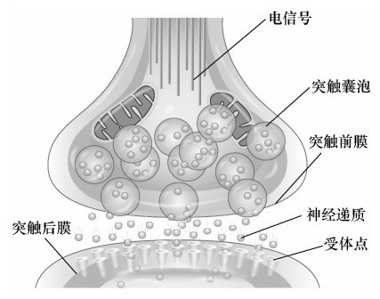 电信号到达第一个神经元的末端后,使之放电并从突触前膜的囊泡里释放神经递质。神经递质通过突触,与突触后膜的受体结合,从而触发下一个神经元,实现信息传递。