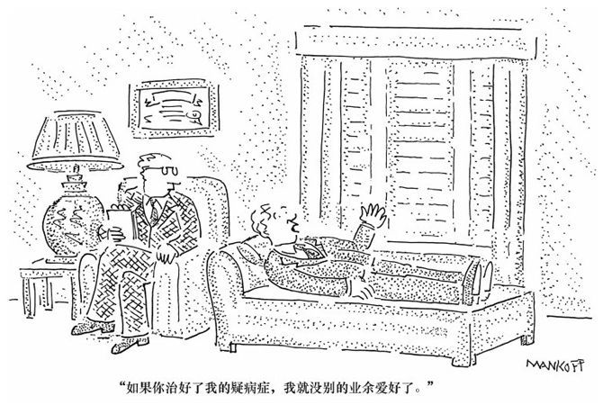 你有过这样的体验吗,当读到关于某种疾病的描述后便怀疑自己患上了该病?或许你对他人提起过这种担忧,但别人会肯定地说你没有,你也就不再担心了。如果尽管有一再的医学保证,仍坚持对患有某种疾病的害怕或关切,那可能就患了疑病症(hypochondriasis)。疑病症患者不一定存在生理症状,而是功能障碍性的“心理定势”导致其对健康、疾病和生理症状的担忧(Starcevic,2006)。他们经常对医生有消极反应,因为他们不能被保证没病。他们的行为类似强迫症中的仪式行为(见第4章)。疑病症患者会不断要求医生确认,不断和家人及朋友谈论其症状,不断核实医疗信息来源,连续监测自己的身体状态(如测血压)。他们还会躲开令他们害怕的情境(Taylor&Asmundson,2004),例如因怕感染而拒绝去医院。虽然对疑病症和焦虑障碍的关系目前仍有争议,但这些恐惧症样的行为使得专家建议将疑病症更名为健康焦虑障碍(e.g.,Abramowitz&Moore,2007)。