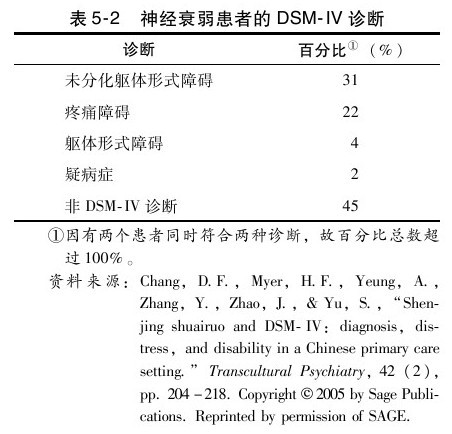 躯体形式障碍的一种文化变体是神经衰弱(shenjing shuairuo)。20世纪90年代早期,将近80%有精神障碍的中国人都被诊断为神经衰弱(Chang et al.,2005)。其症状包括疲劳、记忆力差、易怒、肌肉疼痛和睡眠问题。这些症状在抑郁或焦虑的人群中也很普遍。依据DSM-IV诊断标准,中国55%的神经衰弱患者符合躯体形式障碍诊断标准(见表5-2),但仍有45%属于中国患者独有的神经衰弱。