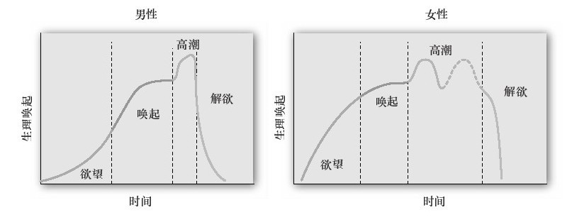 典型的性反应周期包括四个阶段。相比男性而言,在解欲阶段前女性可能会有不止一次的性高潮。