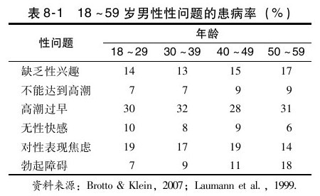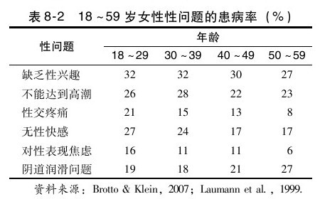 美国对性功能障碍最全面的研究之一是美国国家卫生和社会生活调查,找了3159名年龄在18~59岁的美国被试(Laumann et al.,1999)。这项研究包括面对面访谈和问卷调查,研究数据发现,43%的女性和31%的男性存在性功能障碍。表8-1和表8-2说明了在两性中常见性问题的患病率情况。