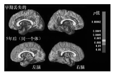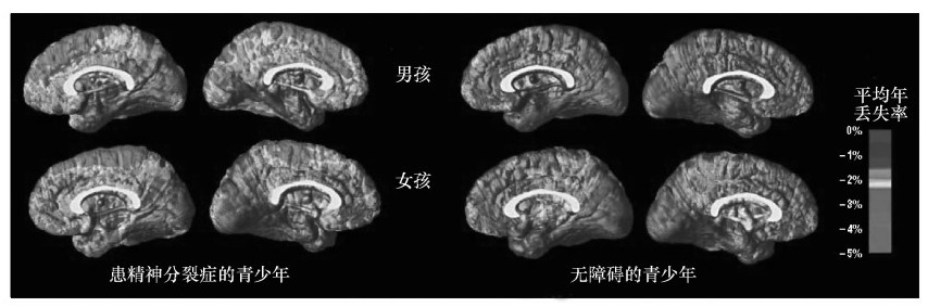 所有青少年都会经历突触修剪。然而,如上面功能性磁共振成像图所示,早发性精神分裂症患者该过程的发展速度非常快。洋红色表示神经元丢失最多的区域,蓝紫色表示神经元丢失最小的区域。