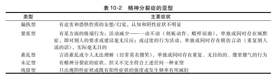 尽管诊断精神分裂症需要三类症状同时存在,但每个患者的症状组合却不相同。不同的症状组合称为亚型(subtype)。表10-2列出了各种精神分裂症亚型及其主要症状。