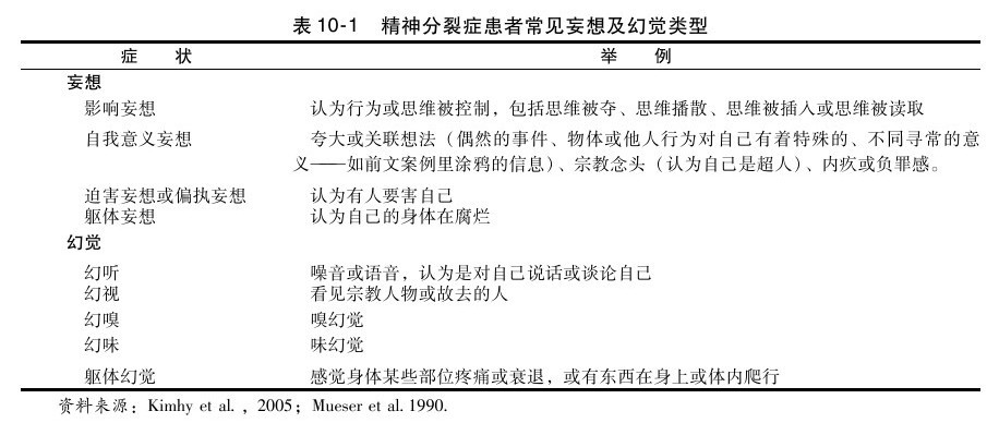 精神分裂症的阳性症状之一是妄想(delusion),即不基于事实的信念(见表10-1)。最常见的是迫害妄想(persecutory delusions)。患者坚信有人害自己或企图害自己,还包括认为自己是特工或某个特殊人物(见前文案例)(Appelbaum et al.,1999)。大多数妄想确实令人苦恼,但有时妄想内容是自大的,当他人没有依妄想内容反馈时,负面后果便会出现。