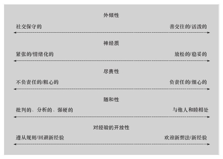 这个模型设想人格有五个基本维度:外倾性、神经质、尽责性、随和性和对经验的开放性。