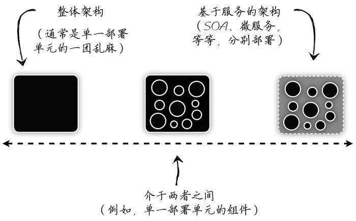 然而,天上不会掉馅饼。构建一个这样的软件系统需要时间、精力和准则。很多人也不需要这种水平的适应性和敏捷性,这就是为什么你看到那么多团队构建的软件系统实际上整体感强得多,各部分捆绑在一起并以单一单元部署。尽管更易于构建,然而这种架构风格在面对变化的需求时通常要花费更多精力去适配,因为功能往往交织在代码库中。