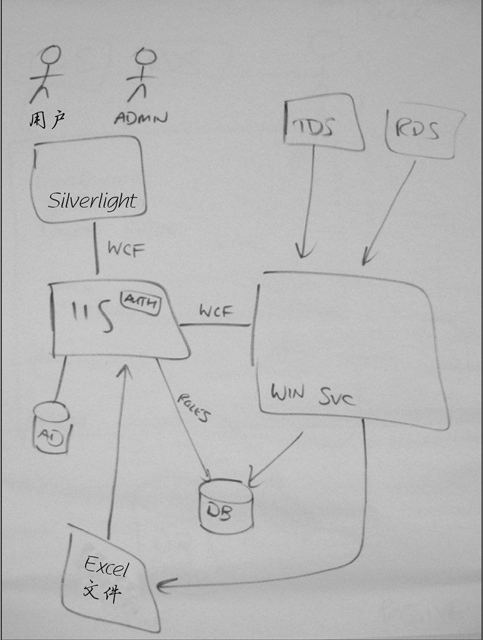 鉴于最近围绕Web 2.0和富互联网应用的传言,培训班里有一个组认为允许通过微软Silverlight应用程序访问数据会很不错。他们已经想过构建一个ASP.NET应用程序,但又喜欢Silverlight提供的更多可能性,比如交互式地切割数据。他们这个决定的另一个驱动因素是Silverlight客户端可以“免费”提供,花费的时间“和构建一个ASP.NET应用程序是一样的”。“免费”是一个非常大胆的观点,特别是考虑到他们有效地向软件系统中添加了一个额外的架构层。下面是我画的他们设计的概况,用以说明增加的复杂度。