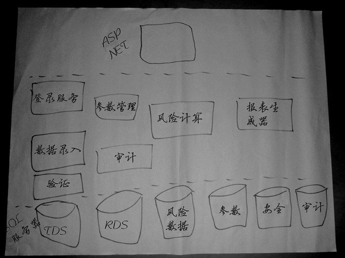 这是一个采用微软技术栈的三层解决方案(在我看来)。顶部是一个ASP.NET的Web层,我认为它被用于某种用户交互,尽管图中没有明示。底部标有“SQL服务器”,有很多独立的“数据库罐”。老实说,我不知道这些是不是独立的数据库服务器、结构或表。