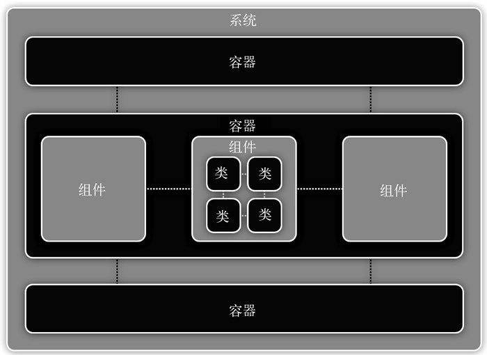假设一个软件使用了面向对象的编程语言,我喜欢用如下方式来思考它的结构:软件系统由多个容器构成,容器又由多个组件构成,组件由一个或多个类实现。大多数软件系统都可以用这种简单的逻辑结构单元的层级关系来建模。