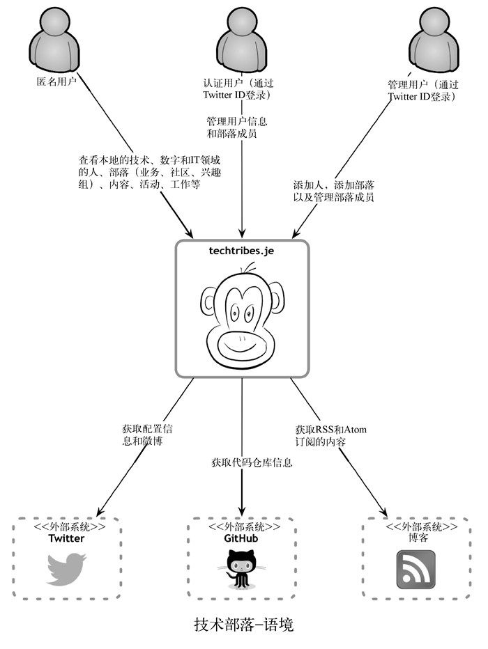 让我们看一个例子。“技术部落”网站1 为在泽西岛和格恩西岛(海峡群岛中最大的两个岛屿)寻找与技术、IT和数字领域相关的人、部落(业务、社区、兴趣组等)和内容提供了一个途径。在最基本的层面上,它是一个本地的微博、新闻、博文、活动、讲座、工作以及更多东西的内容聚合器。这是一个提供可视化总结的语境图。 1 http://techtribes.je “技术部落”-语境 细节在这里不重要,因为这是你退后一步看到的。重点应该放在人(演员、角色、人物等)和软件系统上,而不是技术、协议和其他底层细节。